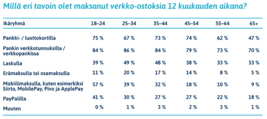 Nuoret asiakkaat käyttävät erityisesti mobiilimaksua, sillä alle 25-vuotiaista 57% sukupuolesta riippumatta haluaa maksaa mobiilimaksulla (Siirto, MobilePay, Pivo tai Apple Pay). Kun taas yli 65 vuotiaista vain 9% prosenttia haluaa käyttää mobiilimaksumahdollisuutta.