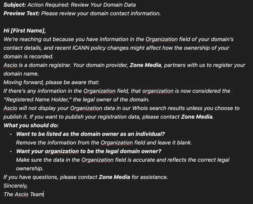 Jos .COM verkkotunnuksesi on rekisteröity organisaation nimissä, saat lähiviikkoina englanninkielisen viestin rekisteröijäkumppaniltamme Asciolta. Siinä pyydetään tarkistamaan tiedot ja varmistamaan, että ne ovat oikein ja vastaavat todellista omistajaa.