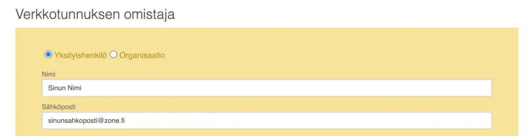 Jos olet rekisteröinyt verkkotunnuksen yksityishenkilönä – valinta löytyy heti rekisteröinnin alussa (ks. kuva alla) – sinun ei tarvitse tehdä mitään. Omistus säilyy nimissäsi.