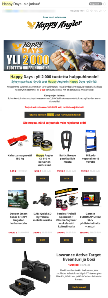 Kalastustarvike Happy Anglerin uutiskirje keskittyy ajankohtaiseen Happy Days ale -kampanjaan, jossa mainostetaan sesongin mukaisia kalastusvälineitä. Klikkaamaan houkuteltiin otsikolla Happy Days – ale jatkuu! Itse kirje alkaa isolla logolla ja näyttävällä kuvalla kalansaaliista. Sen jälkeen esitellään tuotteita, joista klikkaamalla pääsee suoraan tuotesivulle. Myöhemmin sivulla esitellään tarinoita kalastuksesta ja onnistumisista.