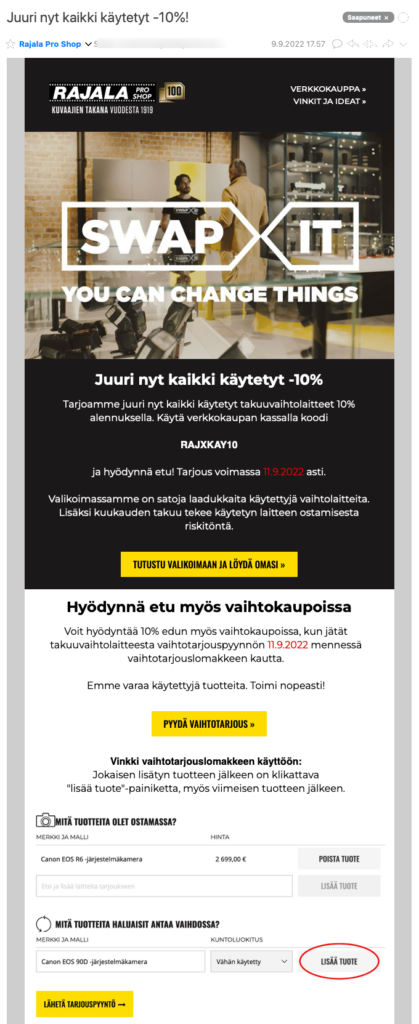 Kameraliike Rajala PRO SHOPIN:n uutiskirje markkinoi SWAP IT-palveluaan, jossa kauppa ostaa asiakkailta kameroita takaisin myydäkseen uuden tilalle. Avaamaan houkutellaan tekstillä Juuri nyt kaikki käytetyt -10%. Kirjeen sisältö keskittyy kokonaan käytettyihin kameroiden myyntiin ja kameroiden vaihtokauppaan.