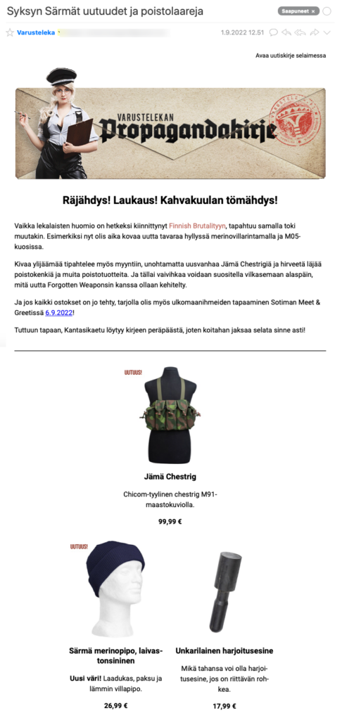 Armeijatavaran myyntiin keskittynyt Varusteleka on tunnettu raflaavasta kielenkäytöstä joka vetoaa verkkokaupan valittuun kohderyhmään. Varustelekan propagandakirje ja verkkokaupan tekstit ovat linjassa keskenään. Niissä molemmissa käytetään kohderyhmään vetoavaa huumoria. Kannattaa liittyä Varustelekan uutiskirjeen lukijaksi ja miettiä millä tavalla omat kirjeet saisi erottumaan vastaavalla tavalla.