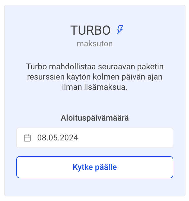 Kun olet siirtynyt Hallinnoituun Virtuaalipalvelimeen, saat käyttöösi uuden ominaisuuden – Turbo-painikkeen. Sen ratkaisun avulla voit käyttää isomman paketin resursseja kerran kuukaudessa 3 päivän ajan ilman lisäkustannuksia.