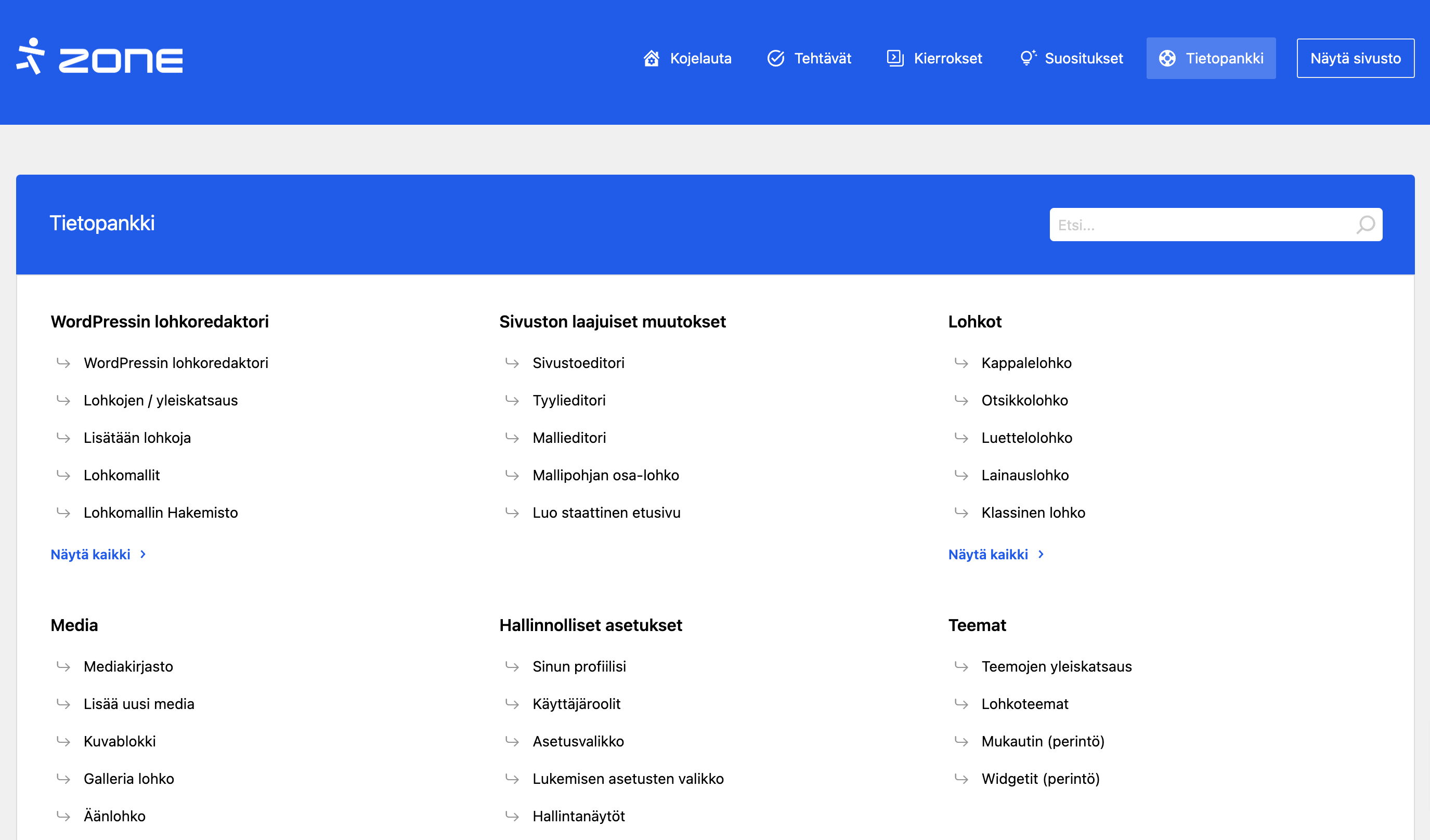 Zone+ AI Assistant tarjoaa sisäänrakennettuja tekoäly opetusohjelmia, usein kysyttyjä kysymyksiä ja asiakastukivaihtoehtoja. WordPress on suosittu avoimen lähdekoodin alusta, jolla on laaja verkkoyhteisö ja lukemattomia resursseja. Ja tietysti tukitiimimme on aina valmis auttamaan!