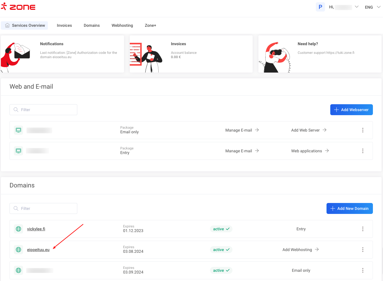 To change the DNS records for a domain, log in to My Zone and click on the desired domain name in the Services Overview page.