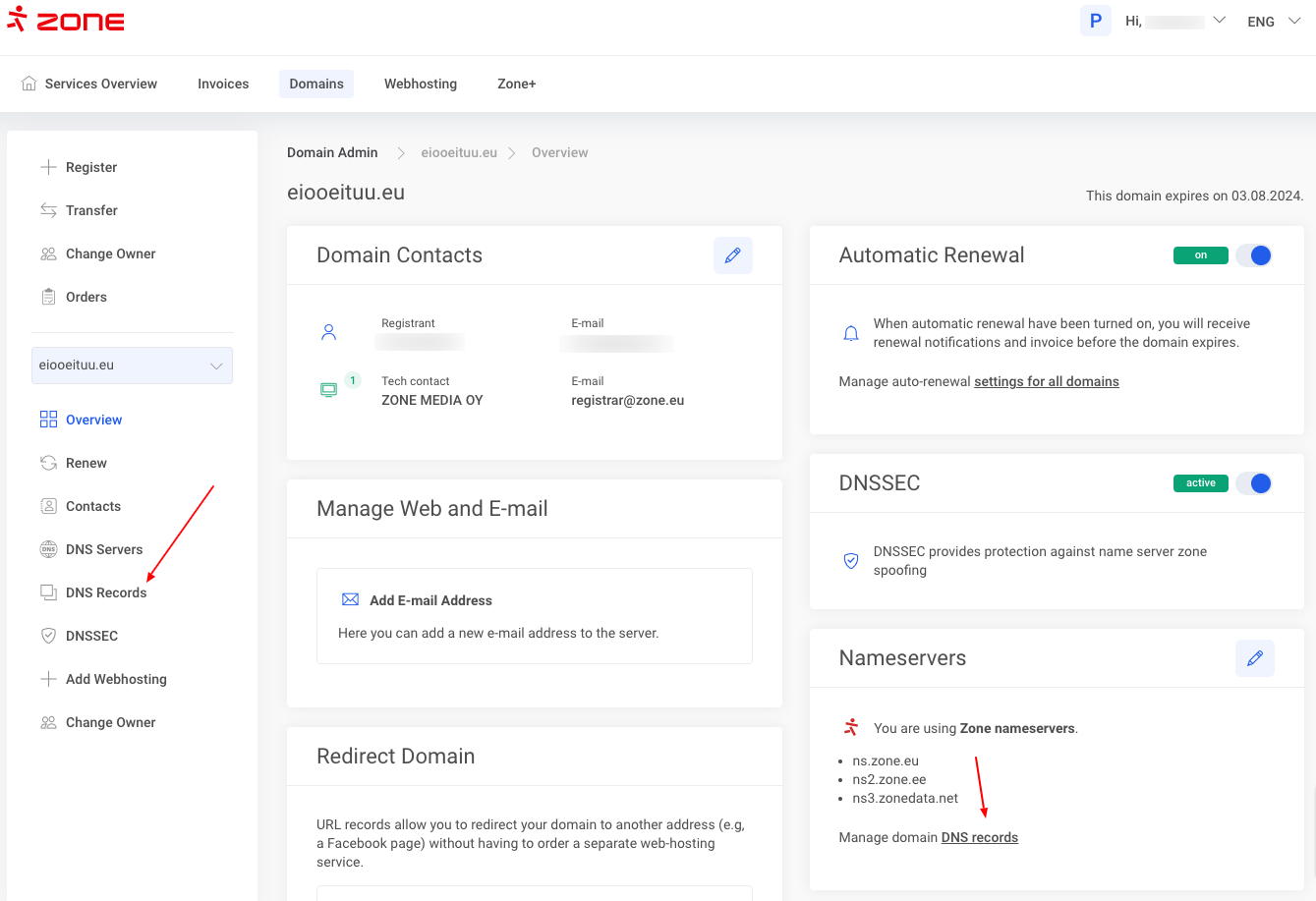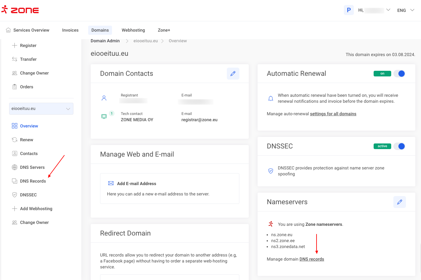 If you only have a domain under Zone management that uses Zone name servers, you can change DNS records from the menu Domains > DNS Records.