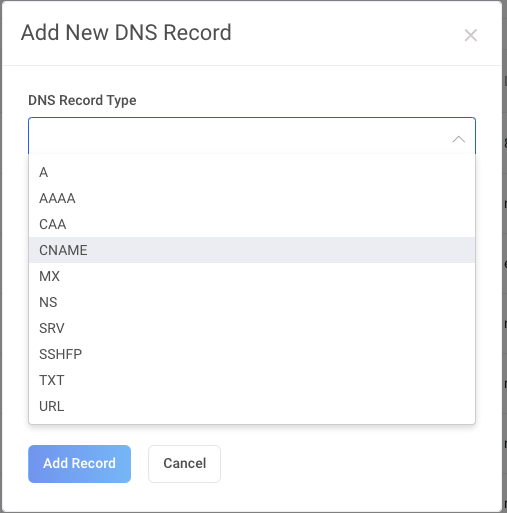 + Add feature allows you to add the following DNS records to a domain: A, AAAA, CAA, CNAME, MX, NS, SRV, SSHFP, TXT, URL.