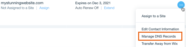 In the WIX control panel, you should first go to the domains view: “Domains“. Then you should click on “Manage DNS Records” for the desired domain.