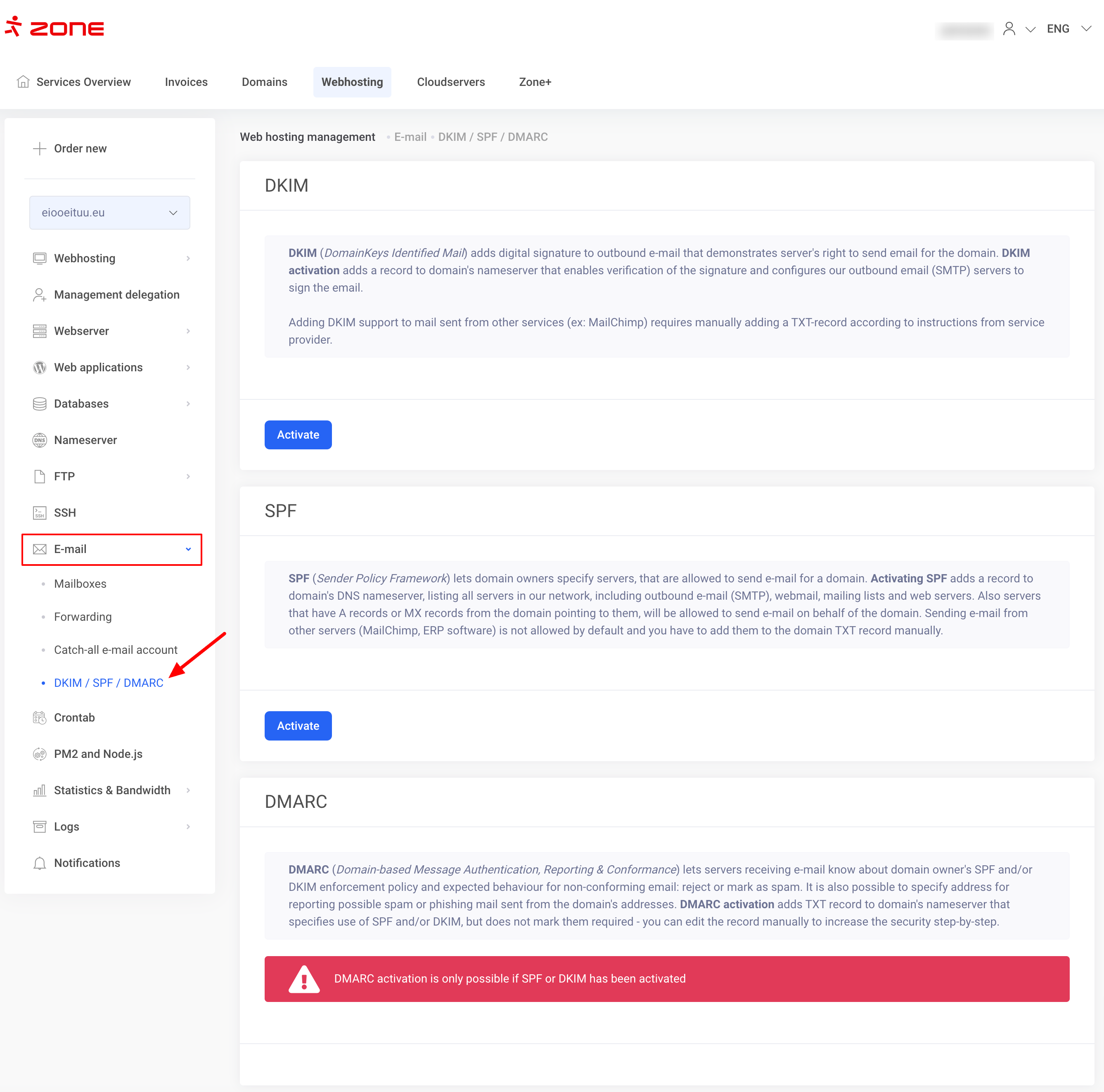 DKIM technology can be activated in the My Zone control panel, through the server management under E-mail -> DKIM / SPF / DMARC.