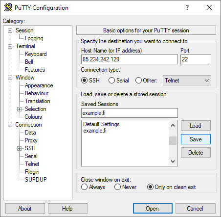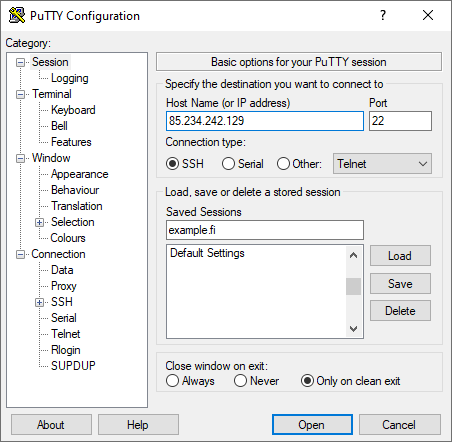 Now the necessary data to establish an SSH connection has been saved and you can establish an SSH connection to the server by clicking the Open button.