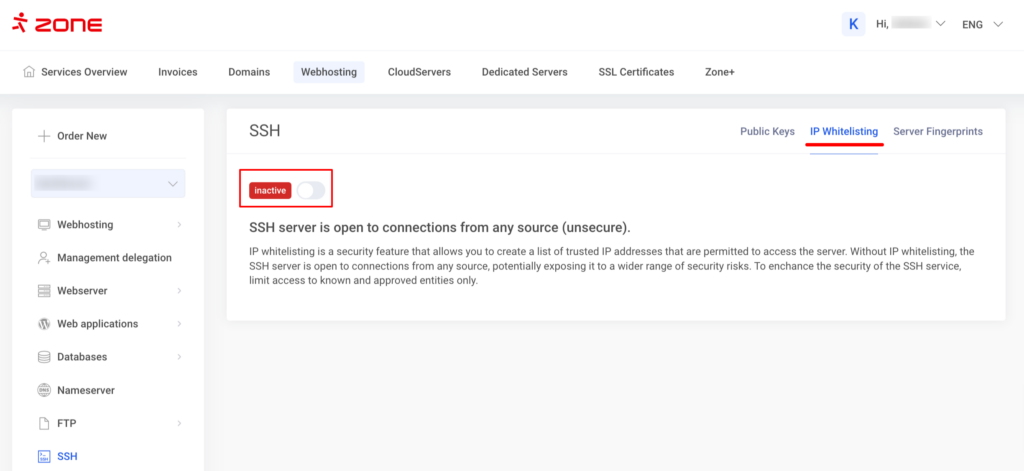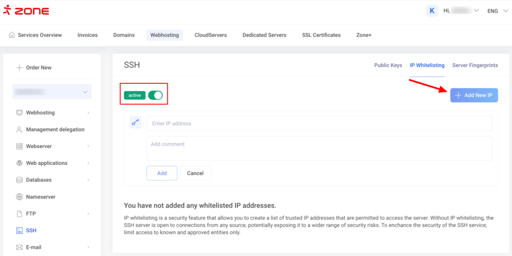 In the IP Whitelist option, you can specify whether the SSH access of the corresponding user is allowed from any source or limited to trusted IP addresses.