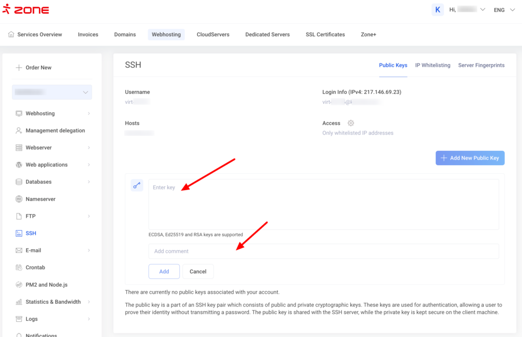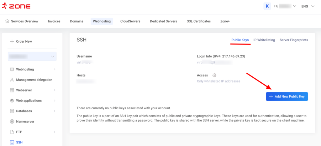 To establish an SSH connection, you must first generate a key pair, the public part of which must be added to the My Zone control panel. The private key remains on your computer, which should be protected to prevent it from falling into the hands of third parties.