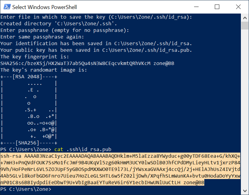 Next, we copy the public key to the buffer. The public key is located in the .ssh directory in a file named id_rsa.pub. You can see the contents of the file by typing cat .ssh\id_rsa.pub in the console. Use the mouse to select the contents of the private key (starts with ssh-rsa and ends with username@computername). To copy it to the buffer, press Enter or right-click on the selected text.