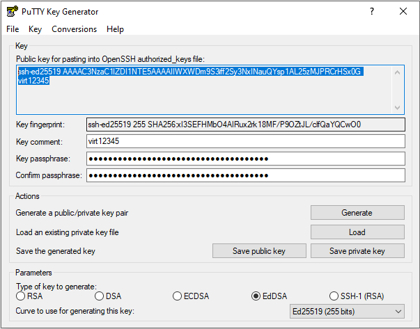 Run the PuTTY Key Generator PuTTYgen, select EdDSA as the key type and click on the Generate button.