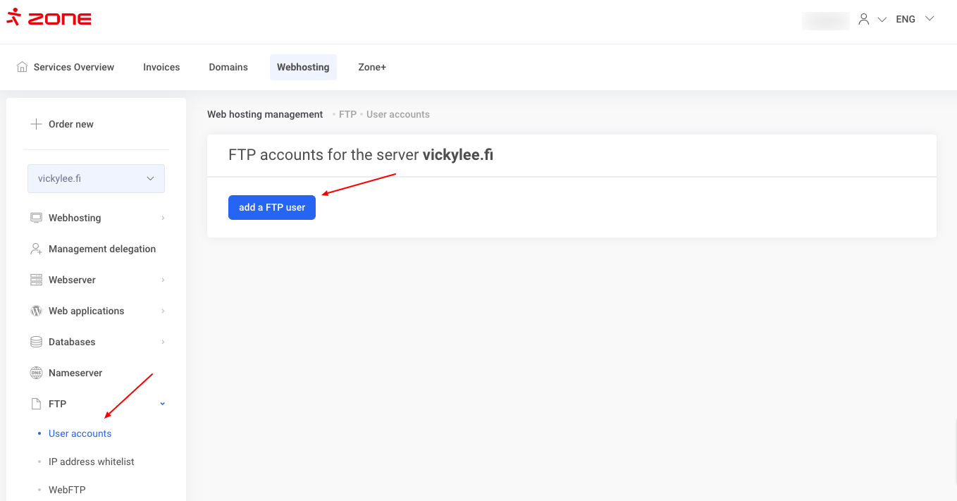 In order to create an FTP account, first log in to the My Zone control panel, then click Webhosting. From the menu on the left choose FTP then User accounts.