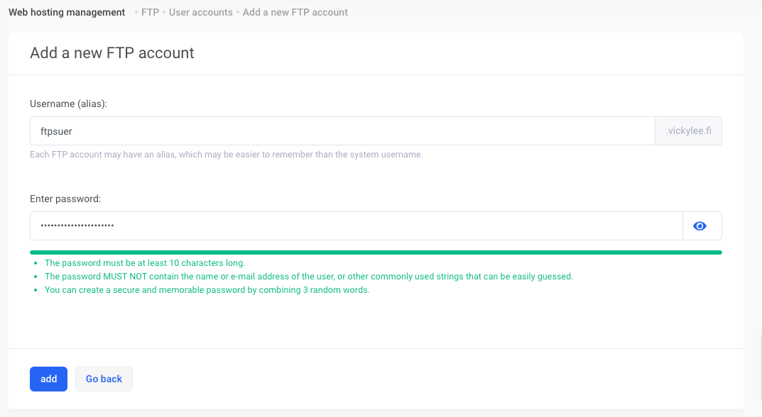 After successfully adding a new FTP account it will be possible to fine-tune its settings. For example, you will be able to restrict the user’s FTP connections by location, forbid insecure connections and set the user a home directory.