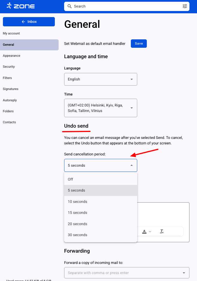 Webmail’s general settings offer you many options for customizing your email. In general settings, you can change your preferred time zone, control panel language, screen view, cancellation period for sent emails, the format of the emails you compose, and redirect copies of incoming emails to other email addresses.