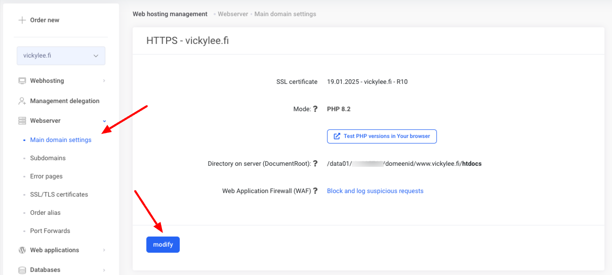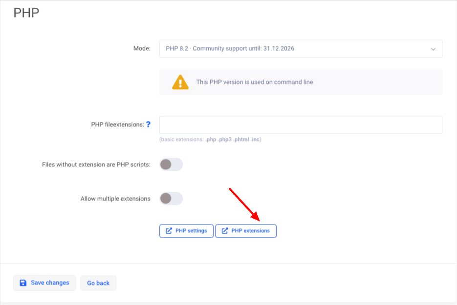 To do this, choose from menu on Webhosting page: Webserver -> Main domain settings or Subdomains depending on whether you want to activate or change the PHP extension on the main domain or on the subdomain.
