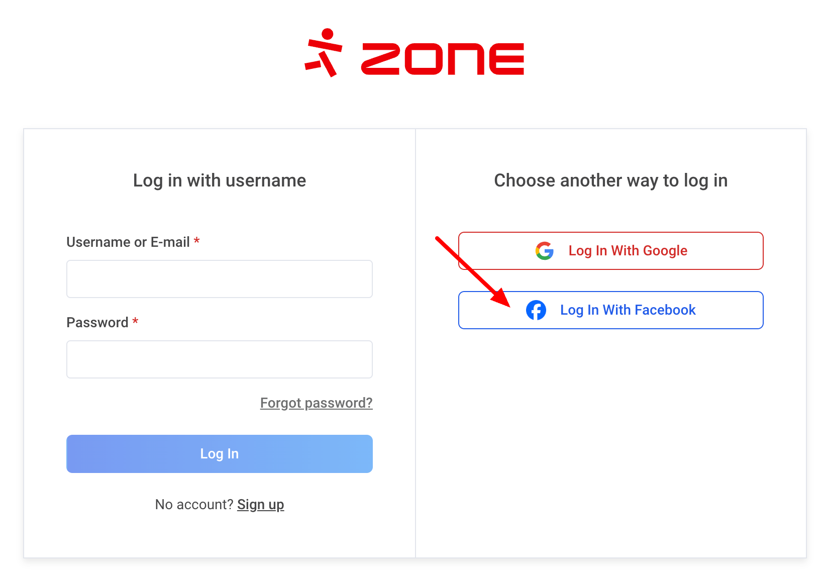 Logging in with Facebook begins selecting My Zone at the top right of the Zone homepage. A login page will open and click Log in with Facebook.