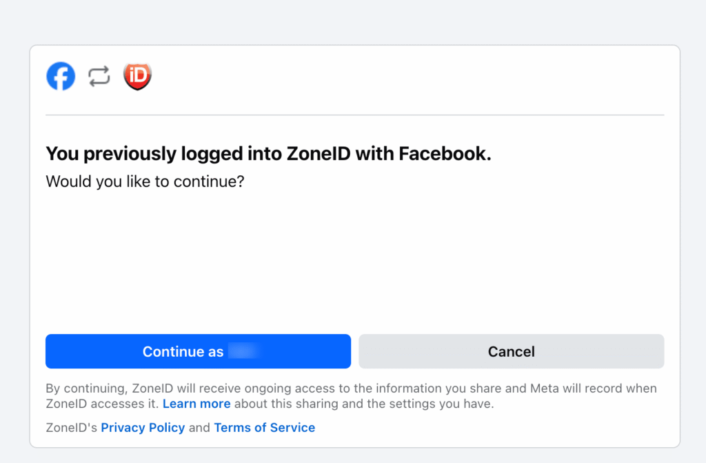 Next, the information about your Facebook account and the selection of associated ZoneID accounts will be displayed. If there are multiple ZoneID accounts linked to this Facebook account, you can choose the preferred one from the dropdown menu. Then, click Continue as ....