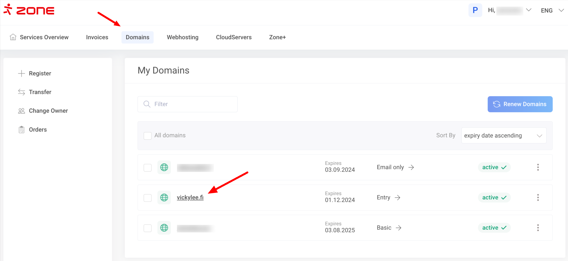 For delegating the domain management, the service owner must first log into My Zone. Then, from the menu on the top choose Domains and click on the domain name you wish to delegate management rights to.