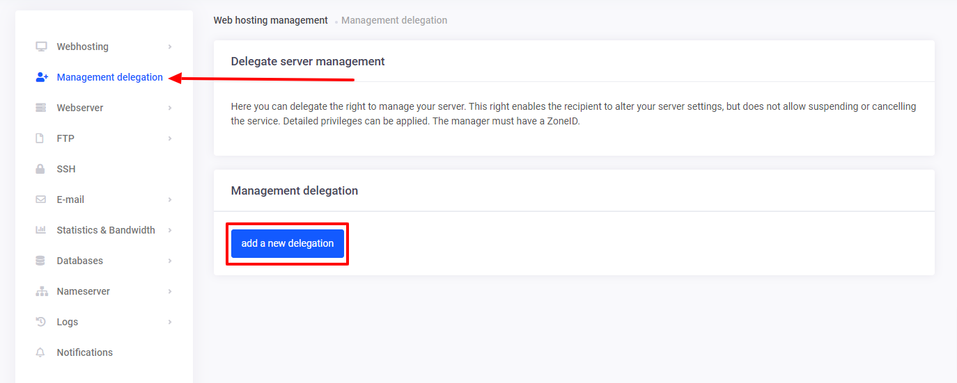 If there are more than one hosting package on the account, open the correct server’s management and choose Management delegation from the left. Click on add a new delegation.