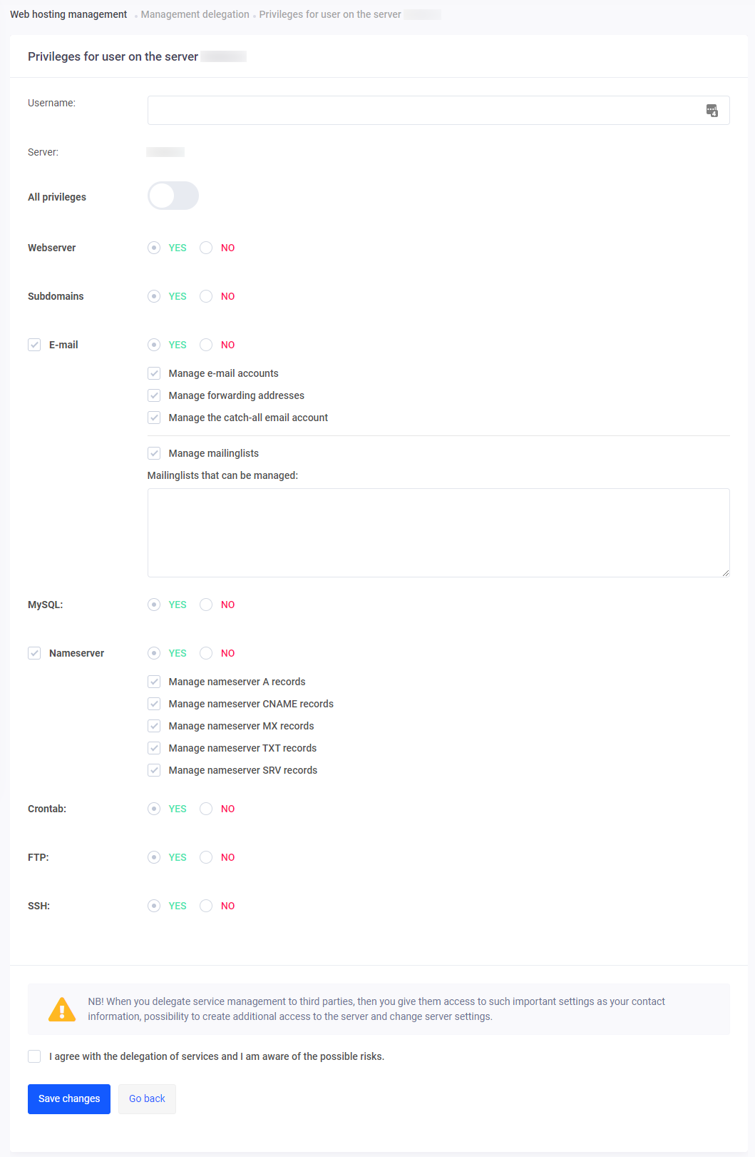 Enter the ZoneID username of the person you wish to delegate management rights to, and choose whether to delegate all possible rights or specific privileges. Once the choice has been made and you’ve agreed you’re aware of possible risks, Save changes.