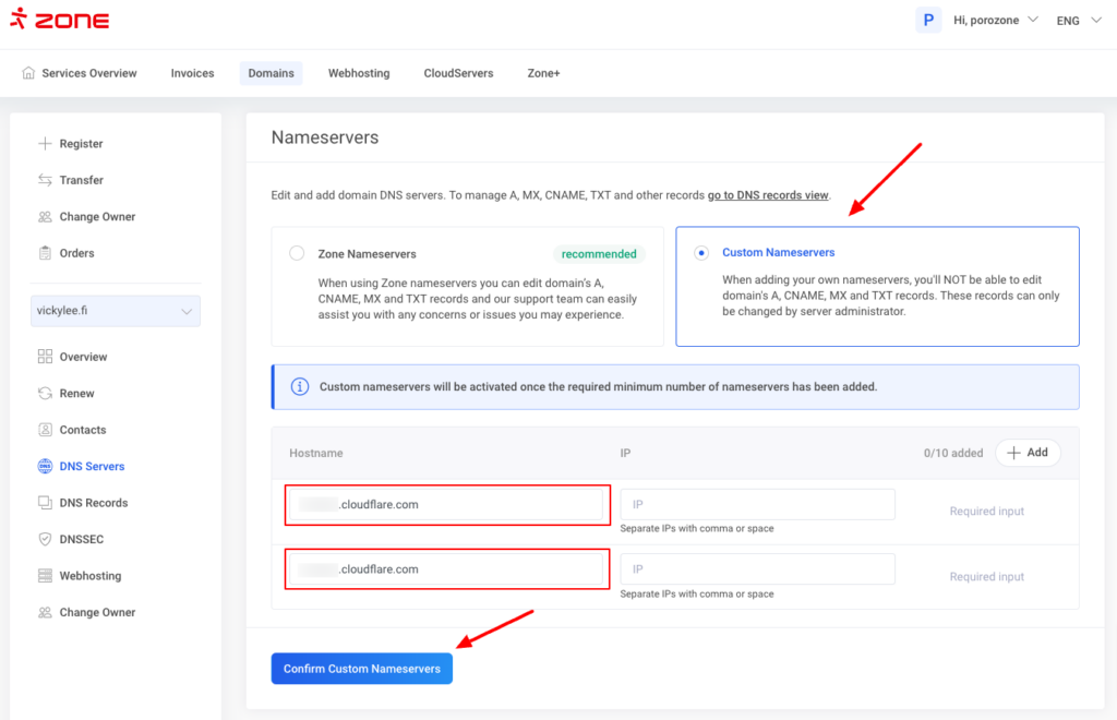 addresses (not mandatory), then click Confirm Custom Nameservers