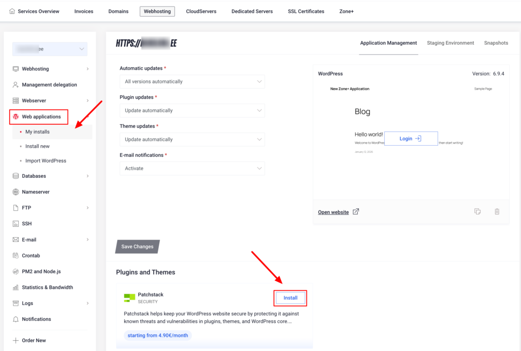 Less than 2 minutes. You can easily install Patchstack on your WordPress application connected to the Zone+. To install, go to Web Hosting in the My Zone control panel (if you have multiple webhostings, select the one where you want to install Patchstack), then choose Web Applications, My installs, and in the Plugins and Themes section click Install.