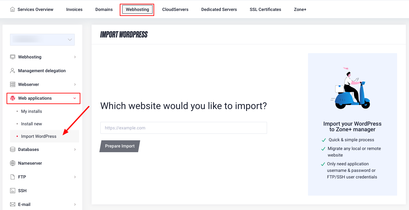 Web Hostingon the overview page, thenWeb Applicationsin the left-hand menu, and clickingImport WordPress. -