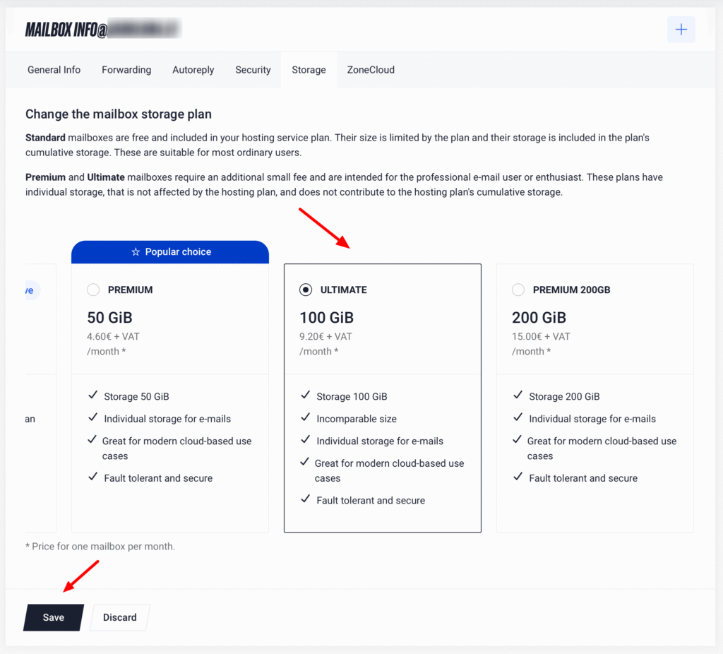 Premium and Ultimate mailboxes require an additional small fee and are intended for the professional e-mail user or enthusiast. These plans have individual storage, that is not affected by the hosting plan, and does not contribute to the hosting plan’s cumulative storage.
