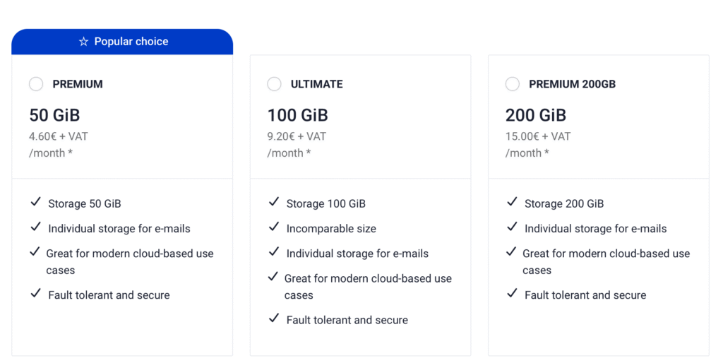 * Price with yearly paying plan is cheaper, that means Premium costs 41.40€+VAT, Ultimate 82.80€+VAT and Premium 200GB 156.00€/+VAT per year.
