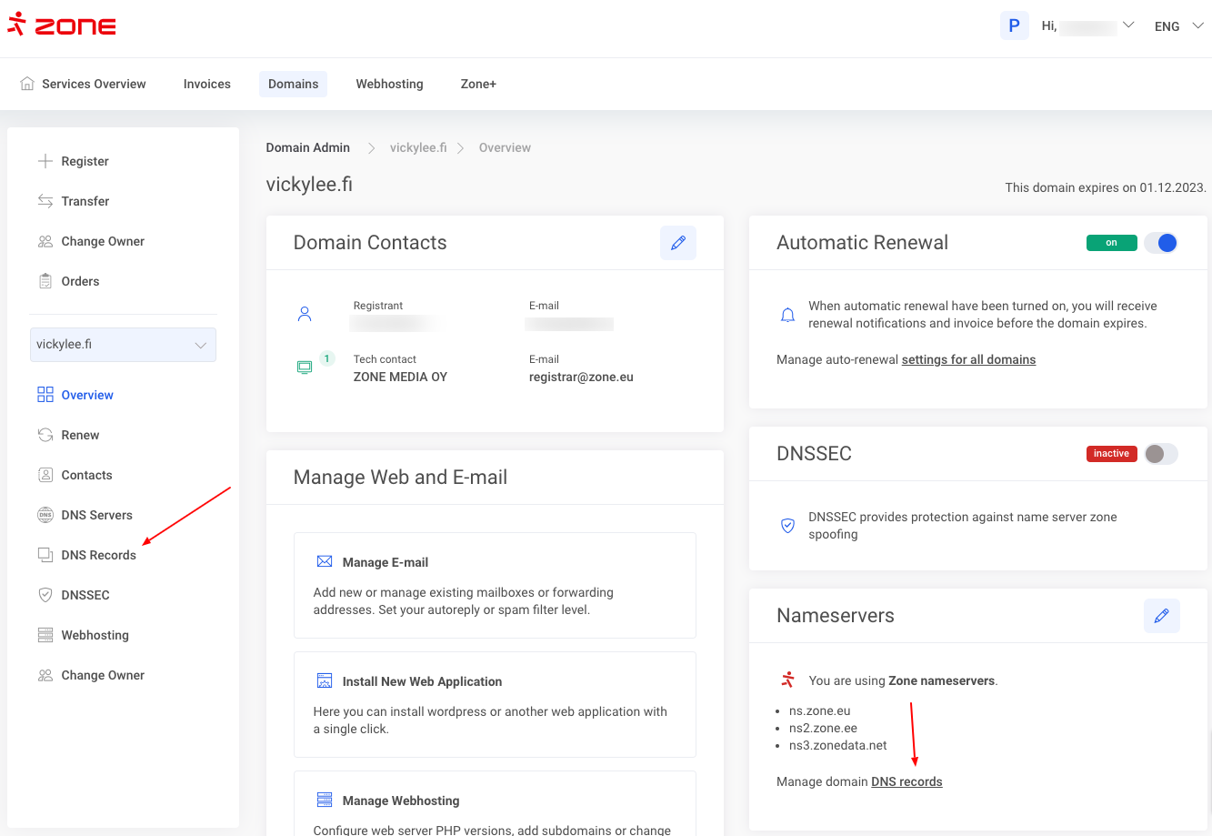 In order to add a record, log in to My Zone environment and click on the desired domain name from Services overview window.