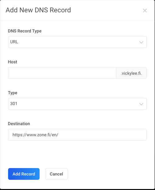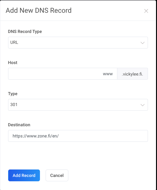 URL records allow you to redirect or forward your domain to another address (e.g, a Facebook page). A URL record can be added to all domains registered at Zone and using our DNS servers.