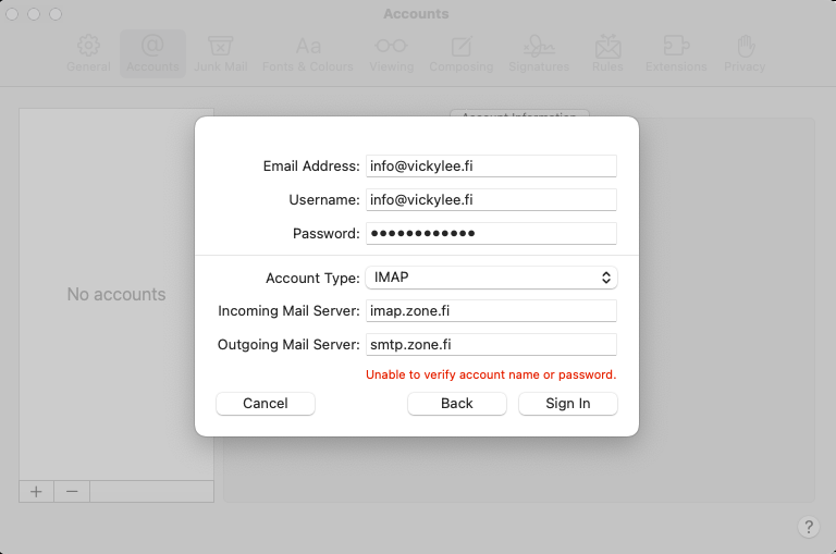 - Outgoing mail server i.e SMTP server: smtp.zone.fi port 465 or 587