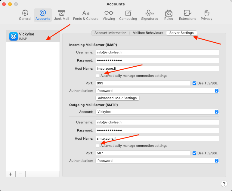 Uncheck Automatically manage connection settings on the Incoming Mail Server (IMAP) and the Outgoing Mail Server (SMTP) to view more detailed settings.