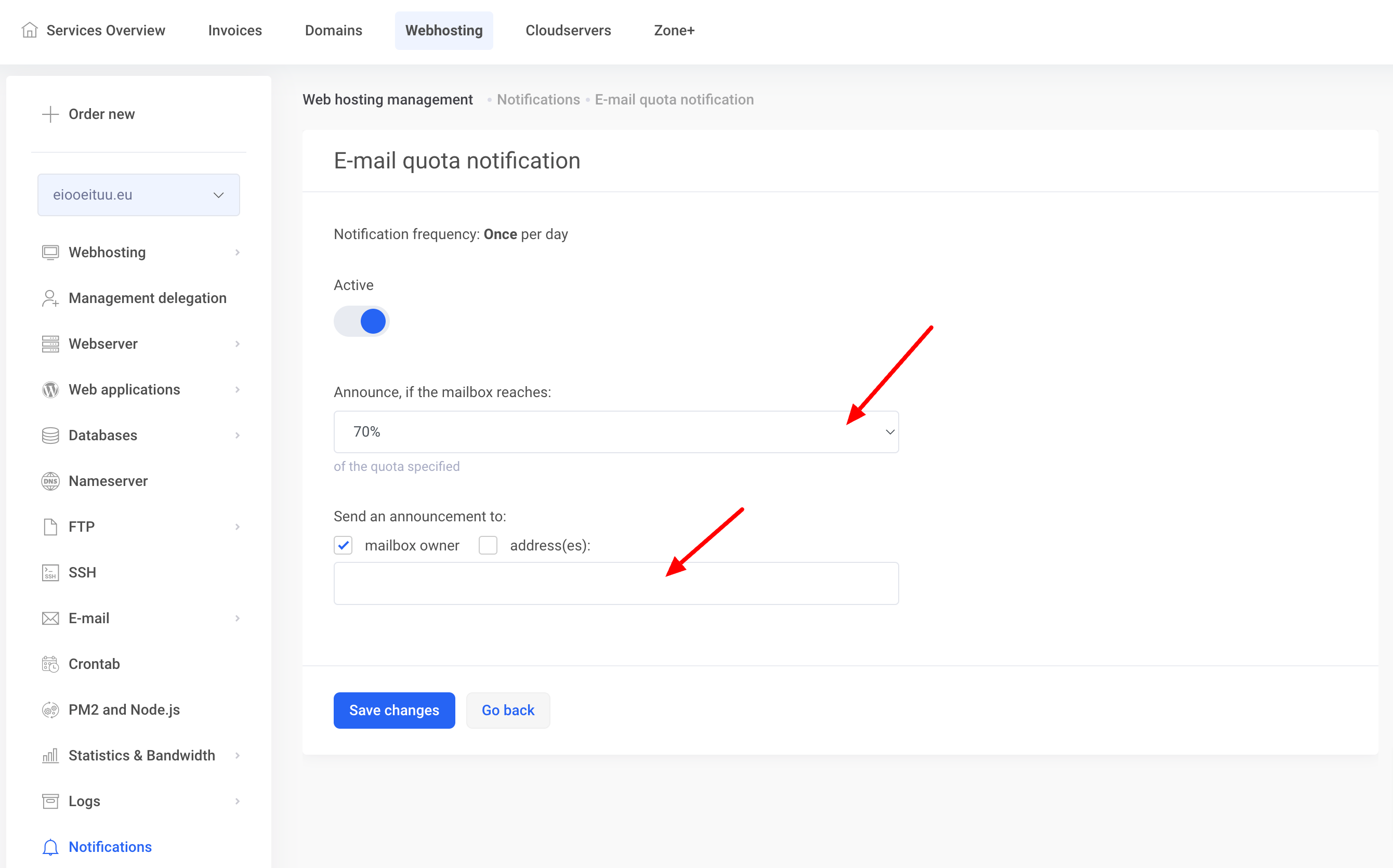 For disk space and inode quota notifications, you can choose whether the notification is sent to the ZoneID account contact email and/or to other desired addresses.