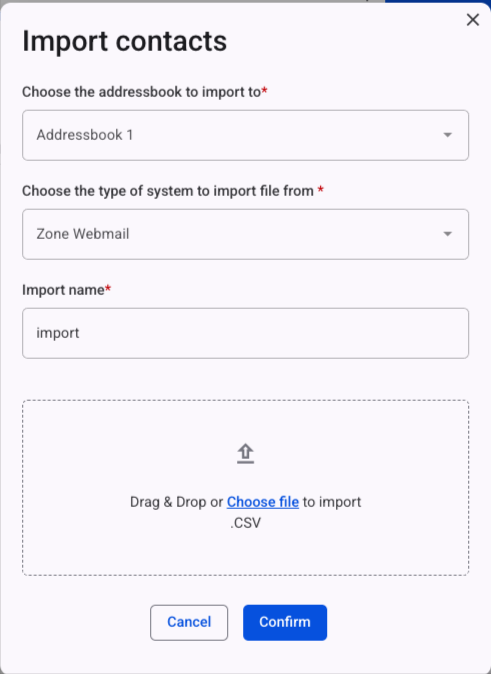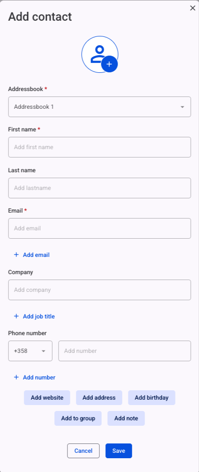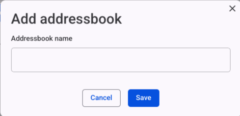 In the new window, select Addressbook, then enter the contact’s first and last name,  and email address. If required, you can also enter the company name, job title, phone number, birthday, etc. Once the details have been entered, click Save and the contact will be saved in the contact list.