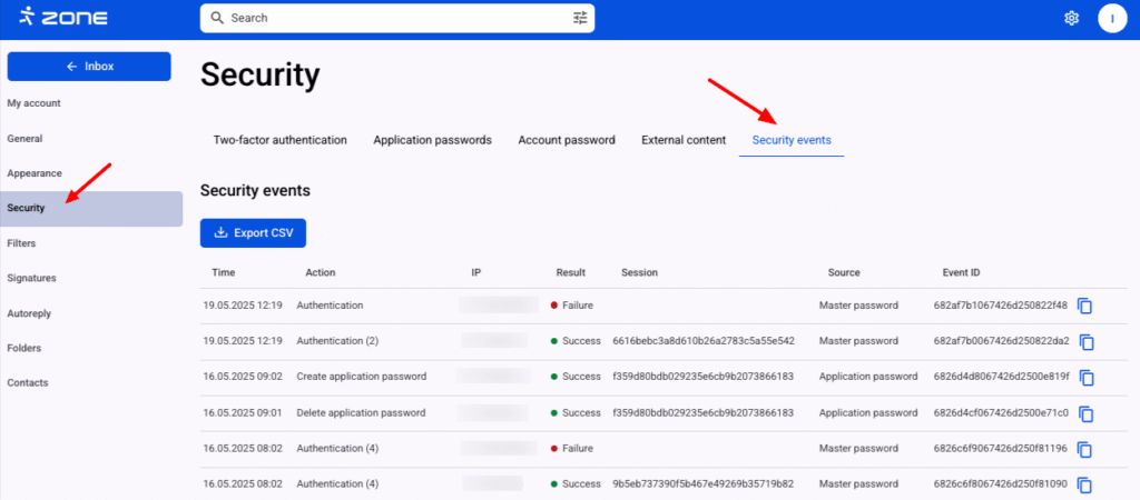 If necessary, the user can check where and how the authentication (or authentication attempt) of his mailbox was made. To do this, go to the Security