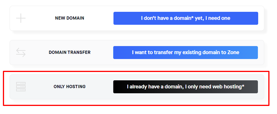 Once you have selected the appropriate package, click on “Get started!”. On the next page choose “I already have a domain, I only need web hosting”.