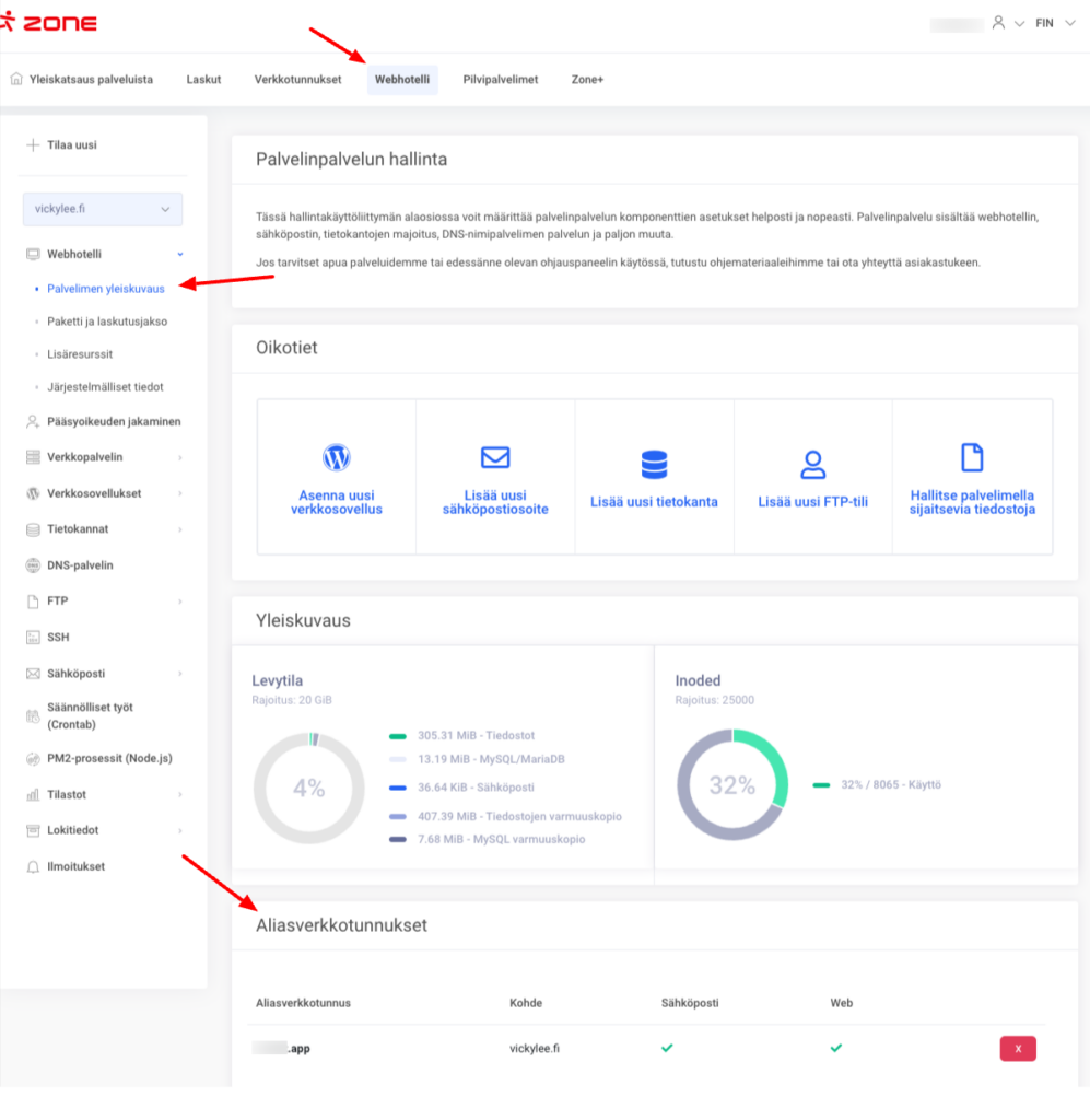 Alias-verkkotunnuksen tilaaminen on mahdollista My Zone:ssa