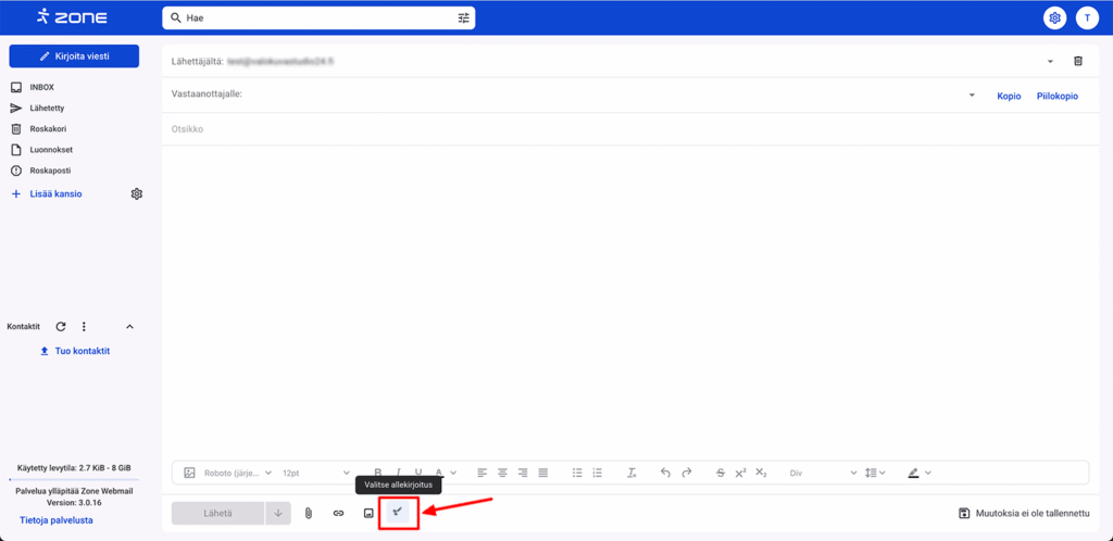 Webmail tarjoaa mahdollisuuden muotoilla allekirjoituksen tekstiä tekstikentän alareunassa olevien työkalujen avulla.