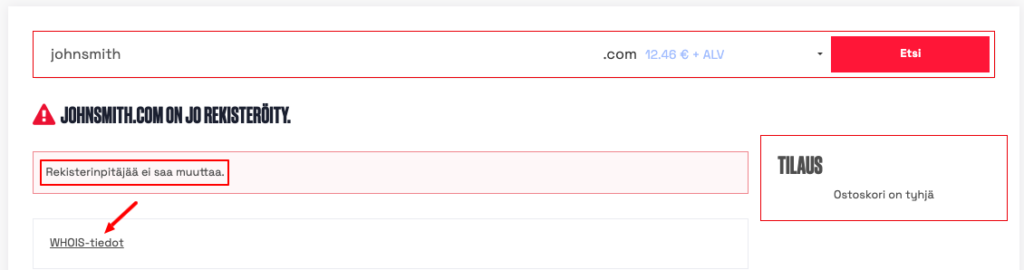Voit tarkistaa verkkotunnuksen WHOIS-tiedot SpeedZonen nettisivulta. Kirjoita verkkotunnus hakukenttään ja avaa Whois-osio.