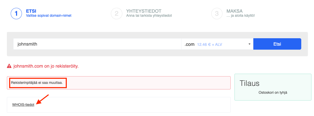 Varmista, että verkkotunnuksen omistajan sähköpostiosoite on ajan tasalla. Tärkeät siirtoa koskevat ilmoitukset lähetetään tähän osoitteeseen.