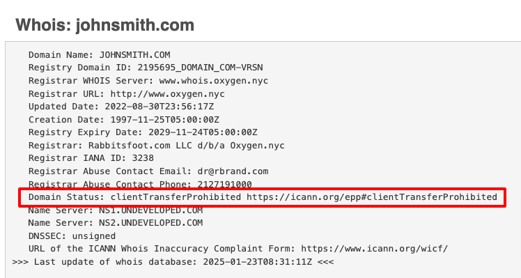 Lukitulla verkkotunnuksella on seuraava tila: Status: Locked ja Status: ClientTransferProhibited.