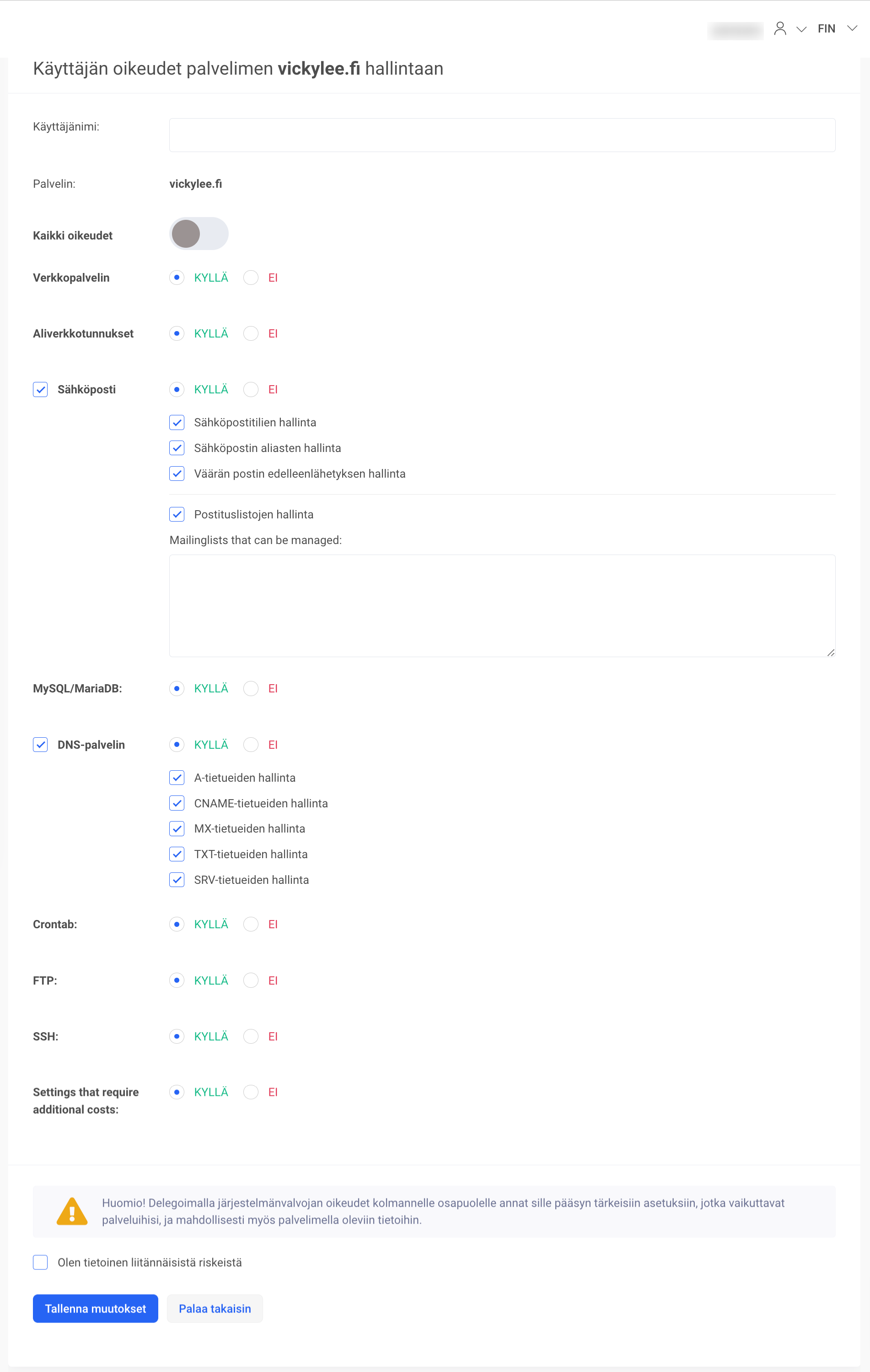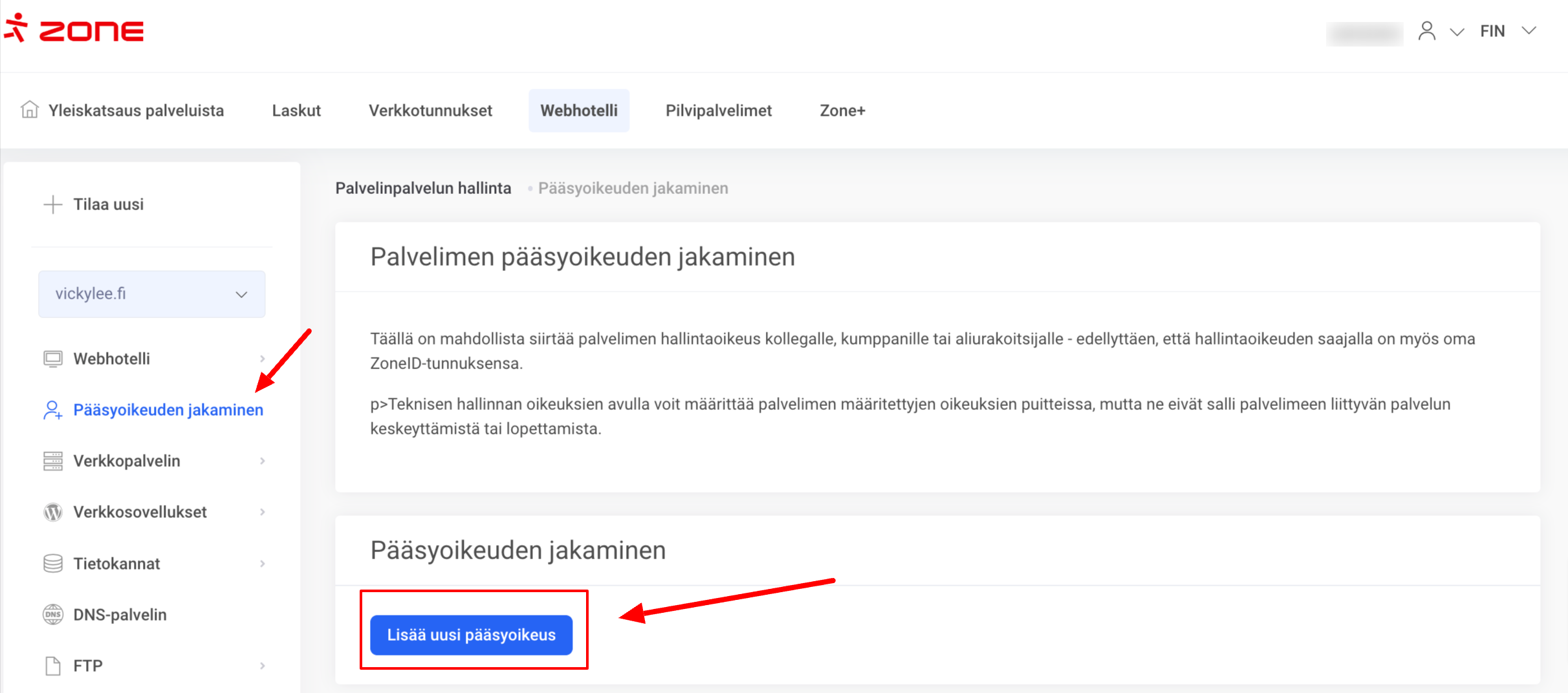 Jos tilillä on useampi kuin yksi webhotellipaketti, avaa oikean palvelimen hallinta ja valitse vasemmalta Pääsyoikeuden jakaminen. Napsauta Lisää uusi pääsyoikeus.