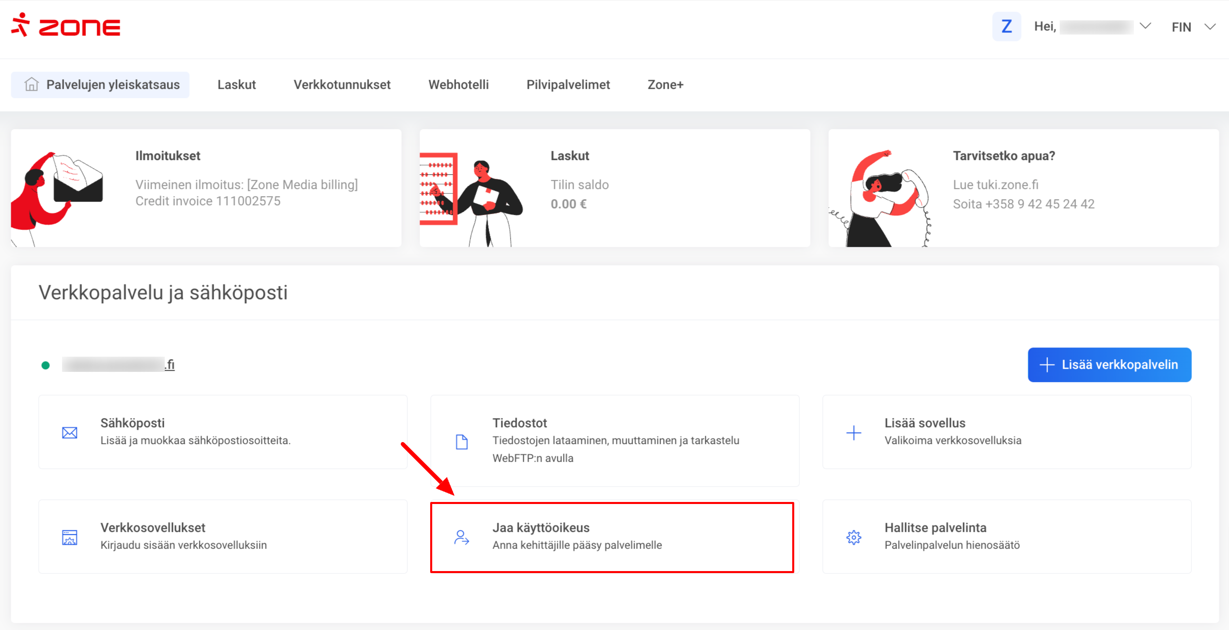 Webhotelli-hallinnan delegoimiseksi palvelun omistajan on ensin kirjauduttava sisään My Zoneen. Valitse sitten Verkkopalvelu ja sähköposti – kohdassa Jaa käyttöoikeus.