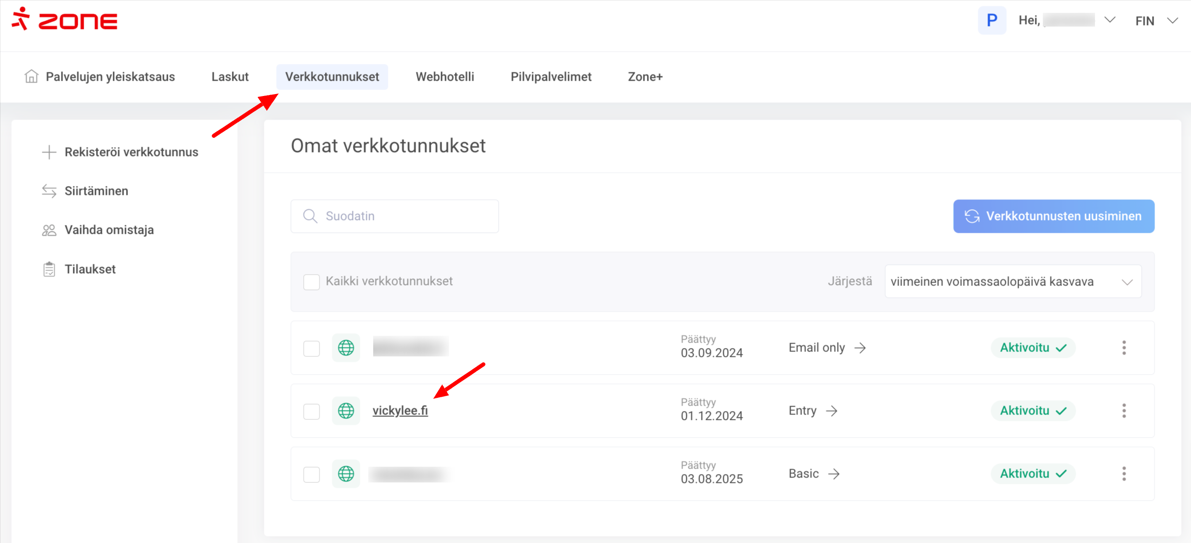 Verkkotunnusten hallinta alueen pääsyoikeuksien jakamiseksi palvelun omistajan on ensin kirjauduttava sisään My Zoneen. Valitse sitten yläreunan valikosta Verkkotunnukset ja napsauta verkkotunnuksen nimeä, jolle haluat siirtää hallintaoikeudet.