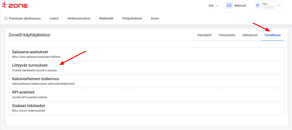 Kirjautuminen Facebookilla edellyttää Facebook-tilisi yhdistämistä ZoneID-tiliisi. Yhdistääksesi Facebookin ZoneID-tiliisi kirjaudu ensin sisään My Zone hallintapaneeliin käyttäjätunnuksellasi ja salasanallasi. Napsauta sitten Asetukset-painiketta näytön oikeassa yläkulmassa olevassa tilitietojen avattavassa valikossa ja ja napsauta avautuvassa ikkunassa oikealla olevaa Turvallisuus-linkkiä ja valitse Liittyvät tunnukset.