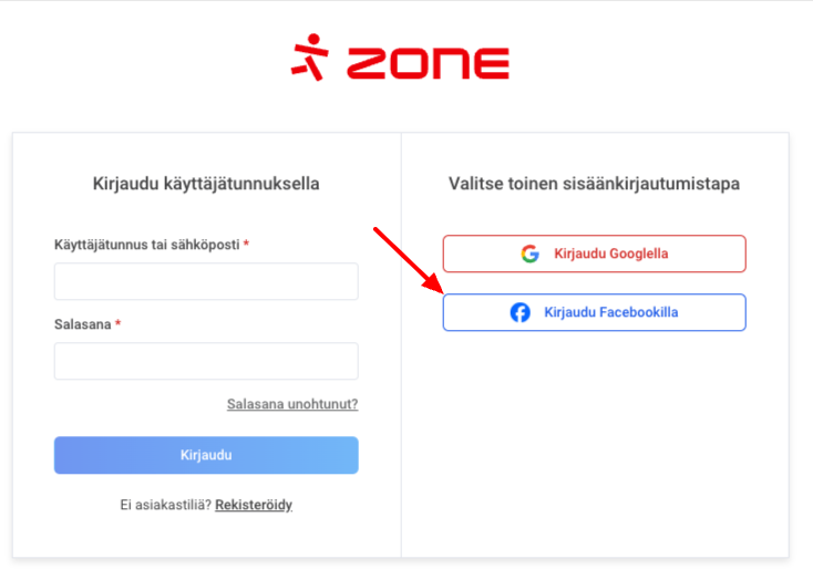 Kirjautuminen Facebookilla My Zone hallintapaneeliin alkaa valitsemalla Asiakastili Zone kotisivun oikeasta yläkulmasta. Kirjautumissivu avautuu ja napsauta Kirjaudu Facebookilla.